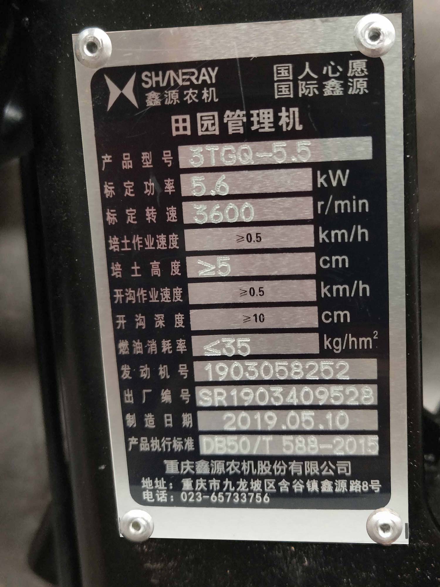 发动机信息: | 动力型号:SR177F/P汽油机、标定功率:5.6kW、制造商:重庆鑫源农机股份有限公司 | ||
