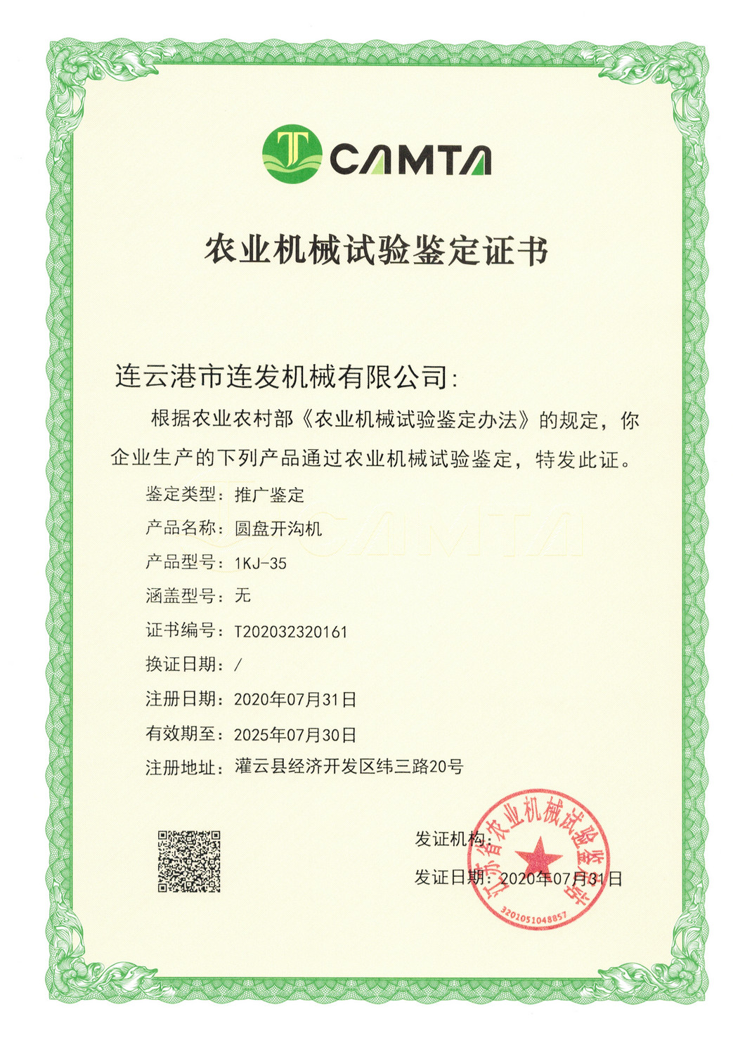 | 发证机构: | 江苏省农业机械试验鉴定站 | ||