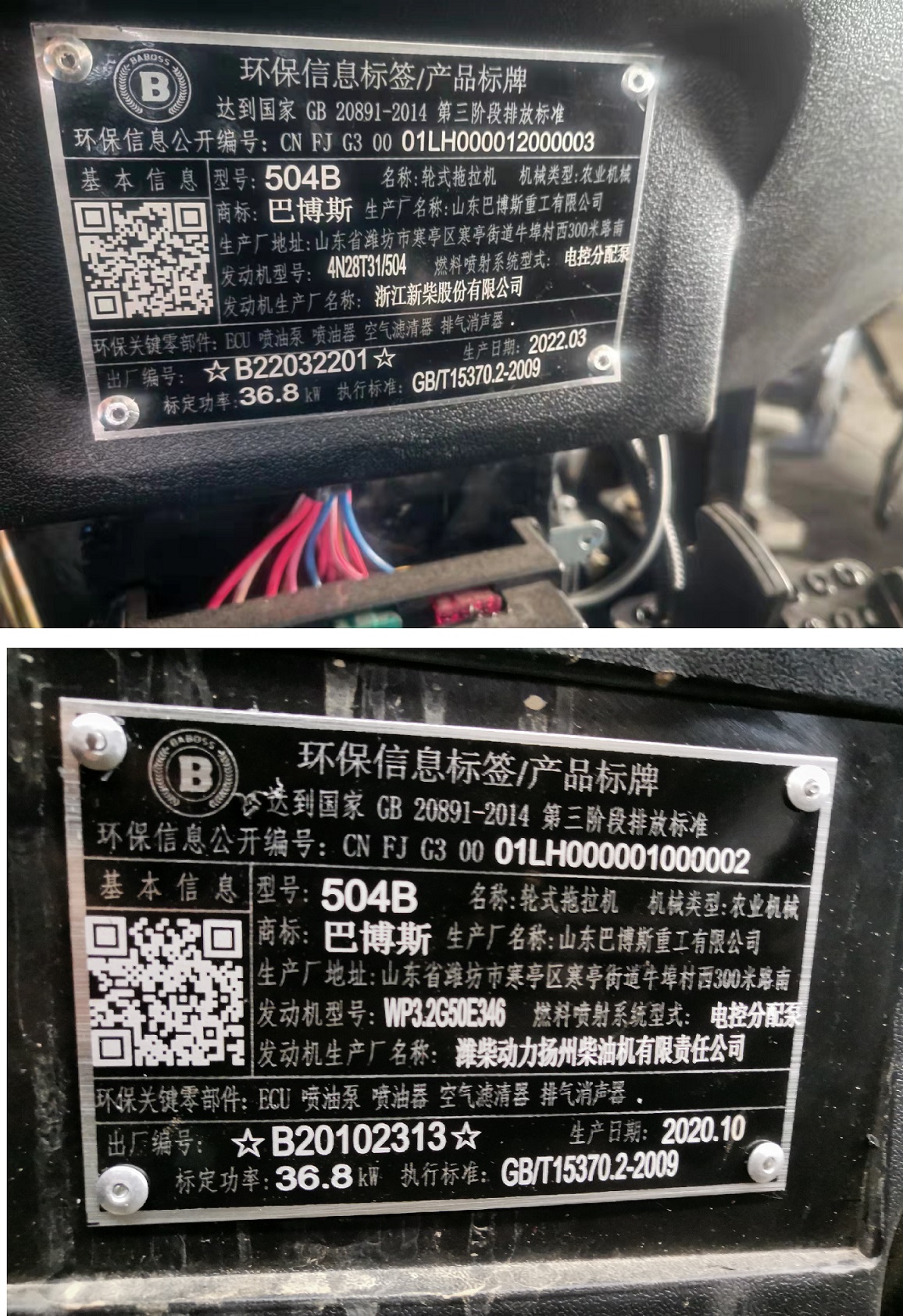 | 详细配置参数: | 驱动方式:四轮驱动;整机外廓尺寸(长×宽×高及部位):3570×1580×2500(安全架顶);最小离地间隙及部位:405(牵引架底部);最小使用质量:1780kg;配置最小使用比质量:48.4kg/kW;功率(马力):50马力;发动机型号:WP3.2G50E346;标定功率:36.8kW;标定转速(r/min):2400;气缸数:4;发动机生产厂:潍柴动力扬州柴油机有限责任公司;排放阶段:国三