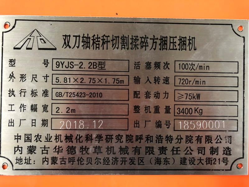 捡拾宽度:2.2m;打捆型式:方捆 ;压缩室截面积(宽×高):0.156㎡;打结器数量:2个; |