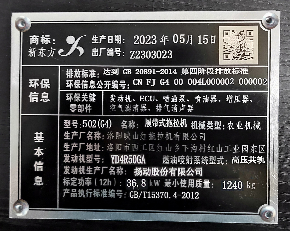 配套动力型号:YD4R50GA;制造商:扬动股份有限公司;气缸数:4;标定功率(kW):36.8;标定转速(r/min):2400;排放标准:第四阶段。 |